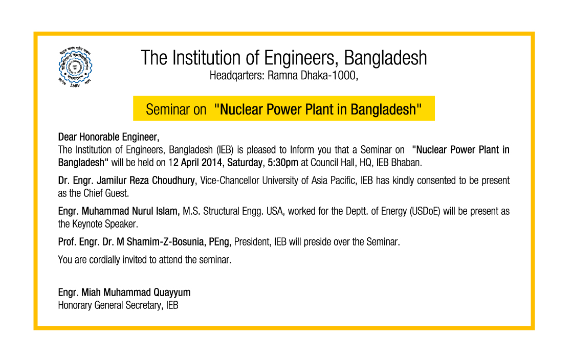 Seminar on Nuclear Power Plant in Bangladesh (Saturday 12 April 5-30 PM)